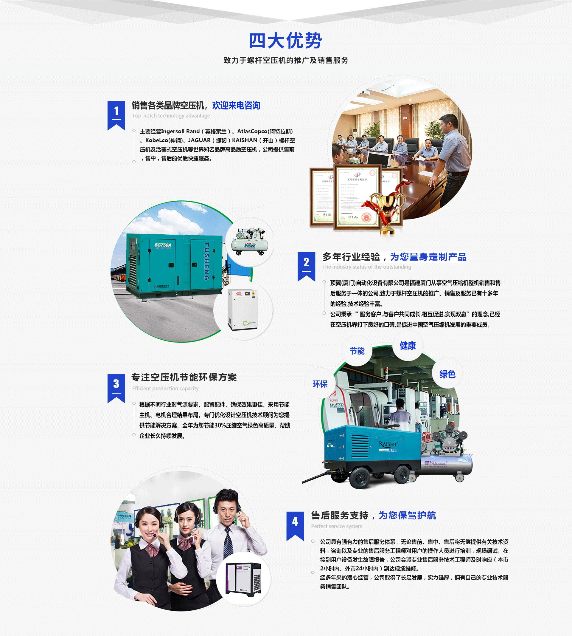 頂翼(廈門)自動(dòng)化設(shè)備有限公司是福建廈門一家從事空氣壓縮機(jī)整機(jī)銷售和售后服務(wù)于一體的公司,致力于螺桿空壓機(jī)的推廣、銷售及服務(wù)已有十多年的經(jīng)驗(yàn),技術(shù)力量強(qiáng)。 公司秉承“服務(wù)客戶,與客戶共同成長,相互促進(jìn),實(shí)現(xiàn)雙贏”的理念,已經(jīng)在空壓機(jī)界打下良好的口碑,是促進(jìn)中國空氣壓縮機(jī)發(fā)展的重要成員。公司具有強(qiáng)有力的售后服務(wù)體系,無論售前、售中、售后將無償提供有關(guān)技術(shù)資料,咨詢以及售后服務(wù)工程師對(duì)用戶的操作人員進(jìn)行培訓(xùn),現(xiàn)場調(diào)試,在接到用戶設(shè)備發(fā)生故障報(bào)告,公司專門會(huì)派售后服務(wù)技術(shù)工程師及時(shí)響應(yīng)(本市2小時(shí)內(nèi)、外市24小時(shí)內(nèi))到達(dá)現(xiàn)場維修。 經(jīng)多年來的潛心經(jīng)營,公司取得了長足發(fā)展,實(shí)力強(qiáng),擁有自己的技術(shù)服務(wù)銷售團(tuán)隊(duì)。主要經(jīng)營IngersollRand(英格索蘭)、AtlasCopco(阿特拉斯)、KobeLco(神鋼)、JAGUAR、(捷豹)KAISHAN(開山)螺桿空壓機(jī)及活塞式空壓機(jī)等品牌空壓機(jī),公司提供售前,售中,售后的快捷服務(wù)。